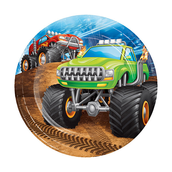 8 premium strength Monster Truck Rally 7in Round Luncheon Paper Plates.