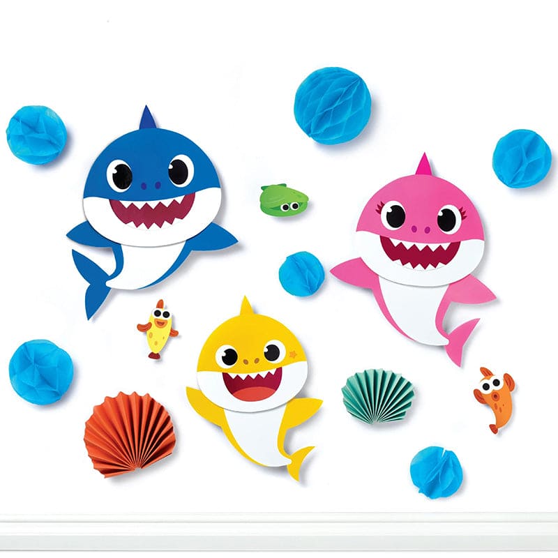 Decorate the party room wall with these smiling Baby Shark decorations that give a festive atmosphere to any Baby Shark themed Birthday party. The pack includes: 3 shark cutouts (13in, 12in, 10in), 2 Paper Fans (5in, 3 1/4in), 3 sea creature cutouts (4in, 2.5in) and 6 Honeycomb balls.