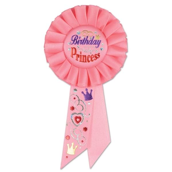 Have the Birthday Girl wear this Birthday Princess Rosette Ribbon on her special day which features a pink color ribbon with metallic lettering that reads BIRTHDAY PRINCESS in the center and surrounded by stars and fancy swirls with hearts along the bottom This pink Rosette Ribbon measures 65in long and includes one per package