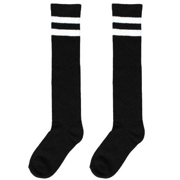 These athletic knee-high socks are solid black with two bright, clean white stripes near the top. One size fits most, two socks per pair.