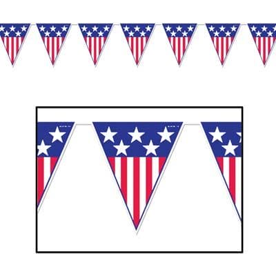 Celebrate any American holiday with our all-weather Spirit of America Pennant Banner, a glorious vision of American flags printed on triangular 11in. pennants that connect to a 12ft. banner cord. The plastic pennant banner is sold individually.