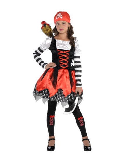 Our Crossbone Cutie Child Costume will make your girl look fierce and cute at the same time with its black, white, and red dress. This Halloween costume also includes a red headscarf with a skull and crossbones print, and black leg warmers. Additional costume accessories and props shown in the image are sold separately.