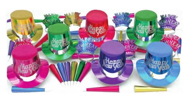 This Elegant Party Kit For 25 People includes: 13 Full Size Curved Brim "Happy New Year" Top Hats, 12 "Happy New Year" Glittered Tiaras and 25 Foil Horns.