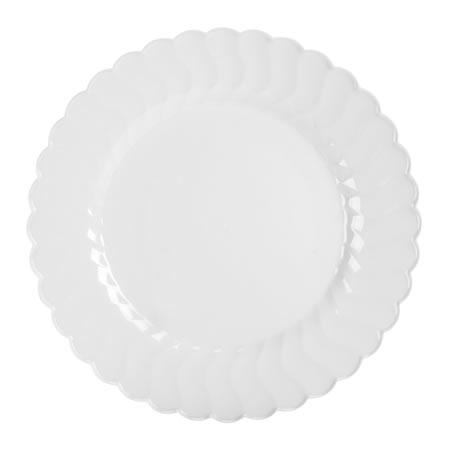 Our Flairware Luncheon Plates are strong solid and sure to suit your serving needs Enhance any table setting with these round white plastic plates featuring a simple yet bold wave design Package includes 18 luncheon size plastic plates with each plate measuring 75in round