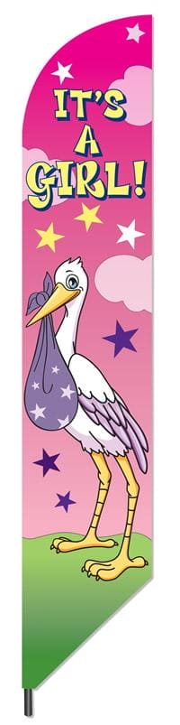 Our ITS A GIRL Pennant Flag is the perfect baby shower outdoor decoration This baby shower pennant flag features an allweather fabric flag with ITS A GIRL headline and in the center a stork with purple bundle on its beak Package includes a plastic pole and nylon pennant flag