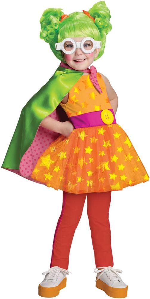 Our Lalaloopsy Girls Dyna Might Costume is perfect for a Halloween trick or treating adventure Everyone will rave about this Girls Dyna Might Costume that is the perfect costume for a Lalaloopsy Fan The Lalaloopsy Girls Dyna Might costume includes jumpsuit with attached tutu cape glasses and wig with bows