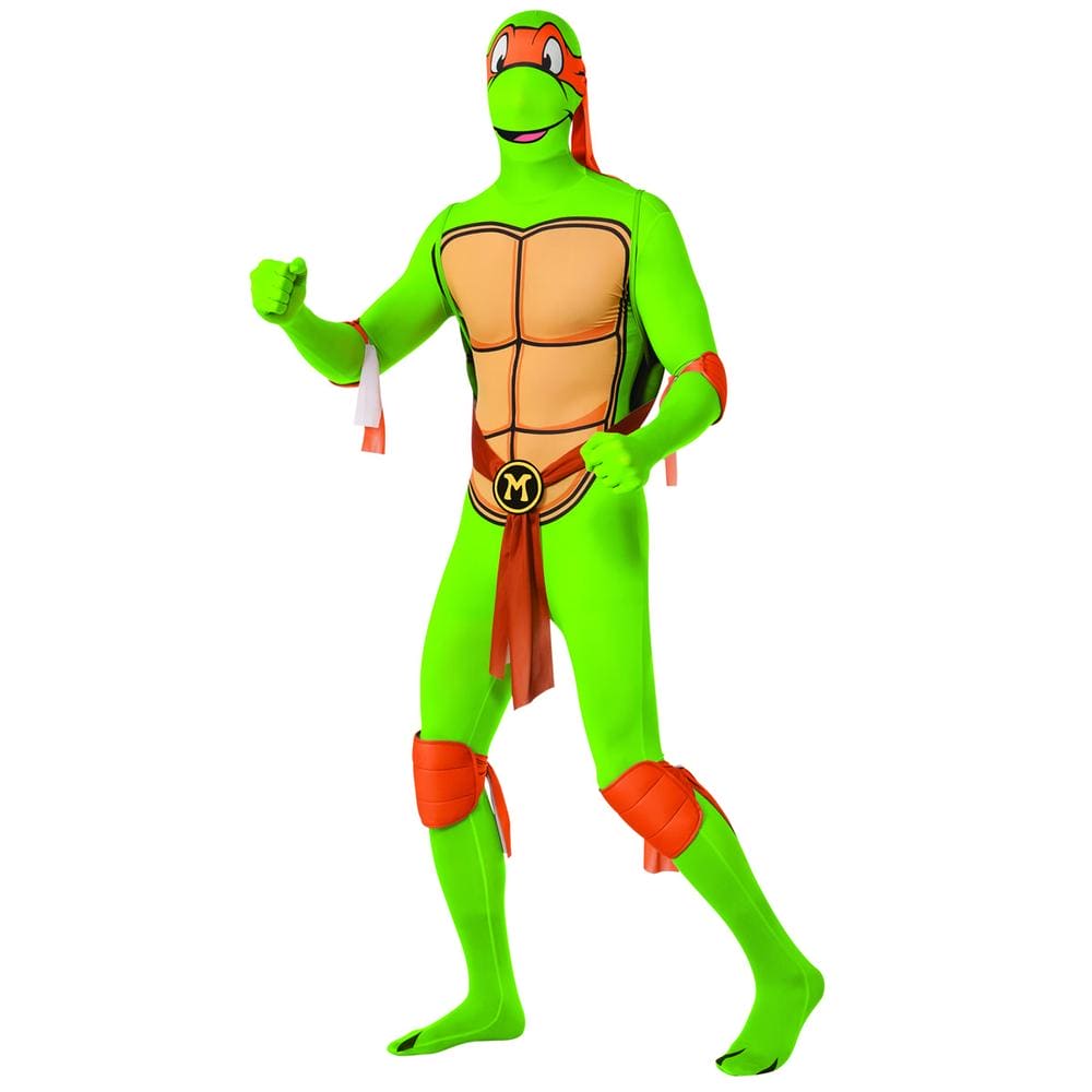 Go out this Halloween in COWABUNGA style! Our officially licensed 2nd Skin Michelangelo Invisible Adult Costume is totally awesome because it's a jumpsuit with the classic Michelangelo character printed all over and includes a 3D shell and elbow and knee pads. This is machine washable and fits most adult sizes.