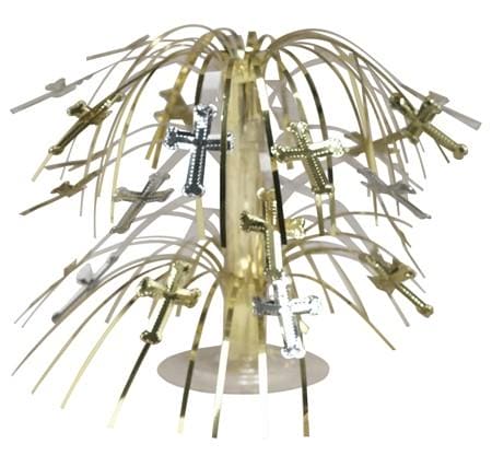Mini Cascade centerpiece with gold and silver foil cross is the perfect tabletop decoration for Baptism First Holy Communion Confirmation or any religious celebration Package contains one mini foil cascade centerpiece