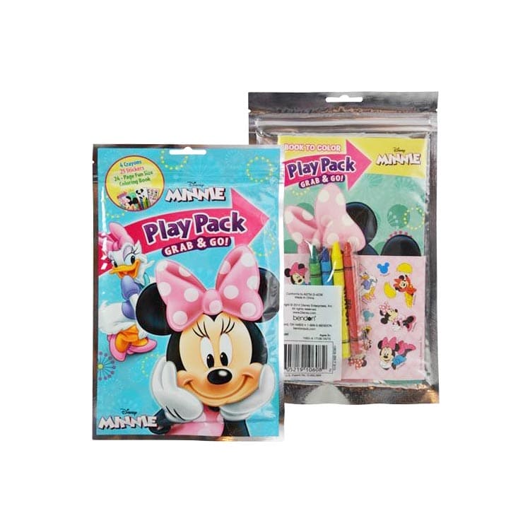 Minnie Grab & Go Play Set includes: 4 Crayons, 25 Stickers and 24-page fun size coloring book.
