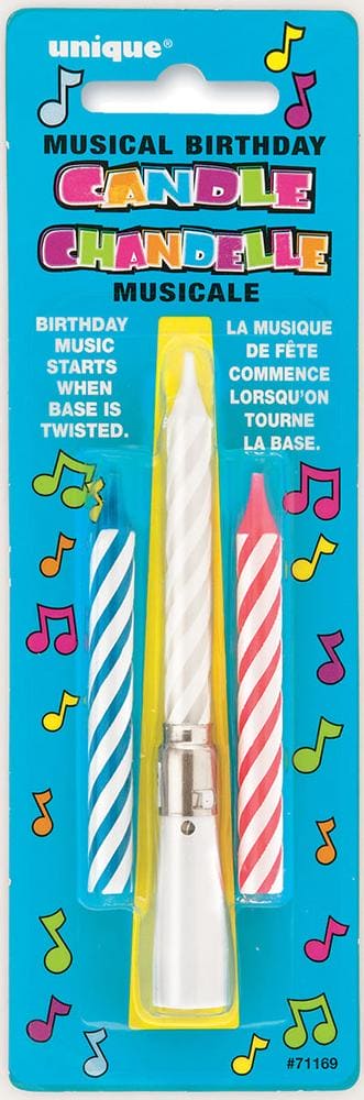 This fun Musical Birthday Candle is ideal for celebrating that special day which comes only once a year The candle adds a special touch to birthday cakes and more Twist the special base and the birthday music starts The package includes three candles with one musical candle base