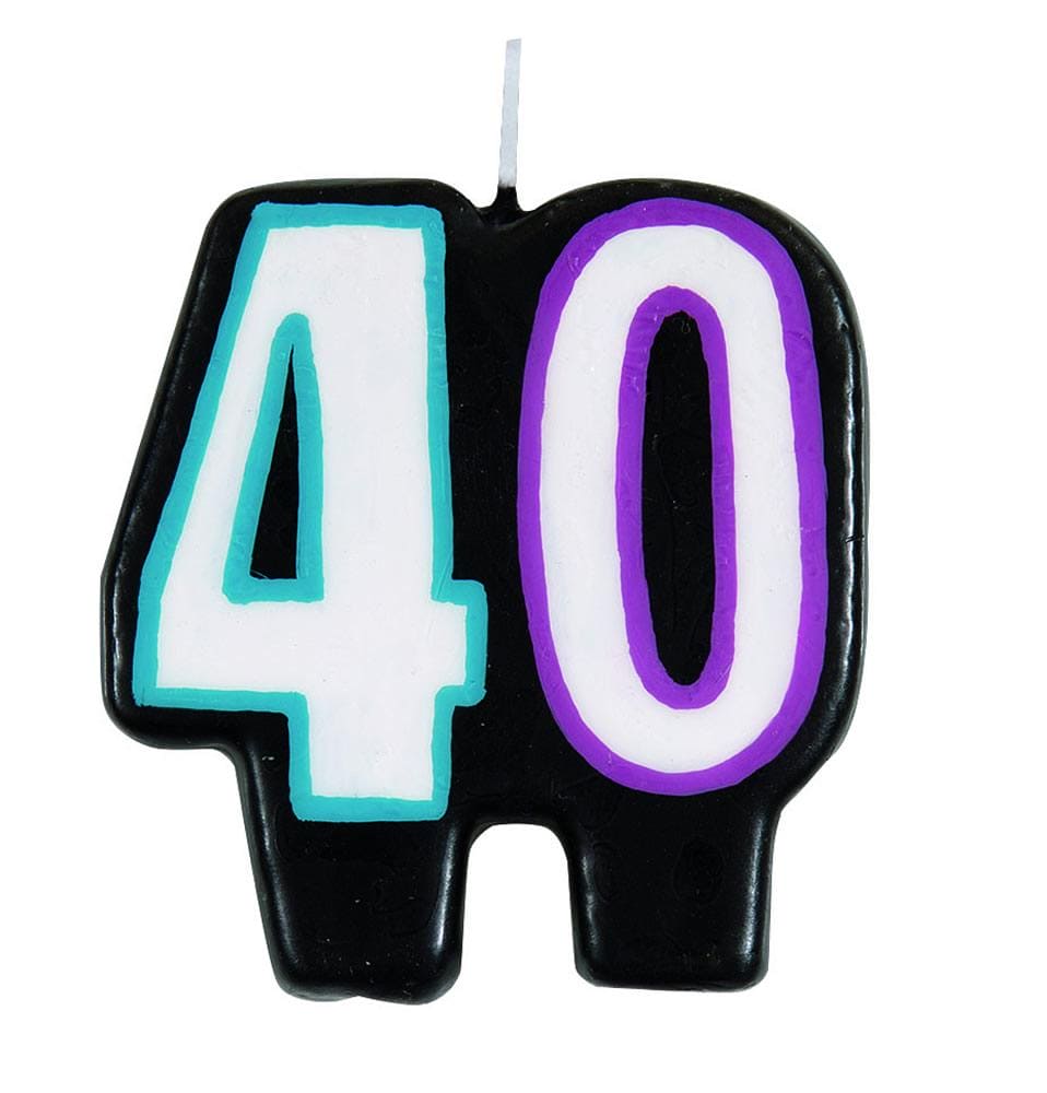Its time Time to bring on the big 40 year Celebrate your 40th birthday with our Numeral 40 Birthday Cheer Candle which can decorate all kinds of cakes This candle shows the number 40 in light blue and purple trim on a black wax candle and is sold individually
