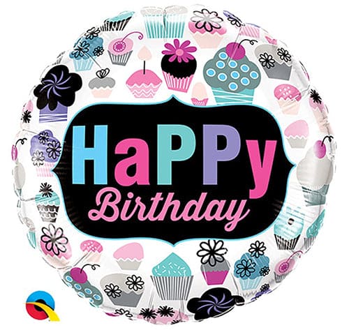 Cheerful balloon with colorful cupcakes in pastel colors and "Happy Birthday" message for any Birthday celebration party decor. One 18in Cupcakes Happy Birthday Metallic Balloon. The balloon is shipped uninflated.