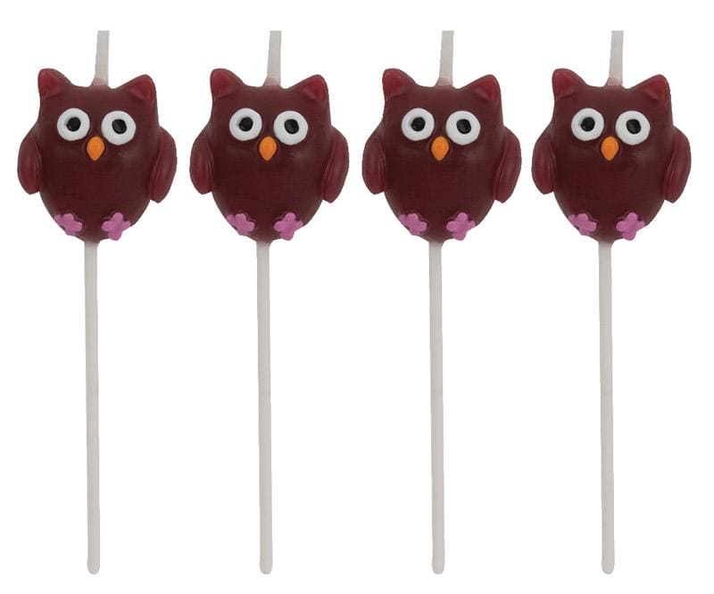 Owl Pal Birthday Owl Pick Candles measure 3.25in and package contains 4 owl molded cake candles.