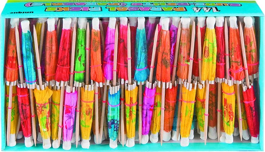 These colorful and fun umbrella toothpicks adds a tropical touch to any party The picks can be used with a fruit garnish of a tropical drink finger foods appetizers and more The package contains 144 assorted color Paper Parasol wood Picks measuring 4 inches great for big parties