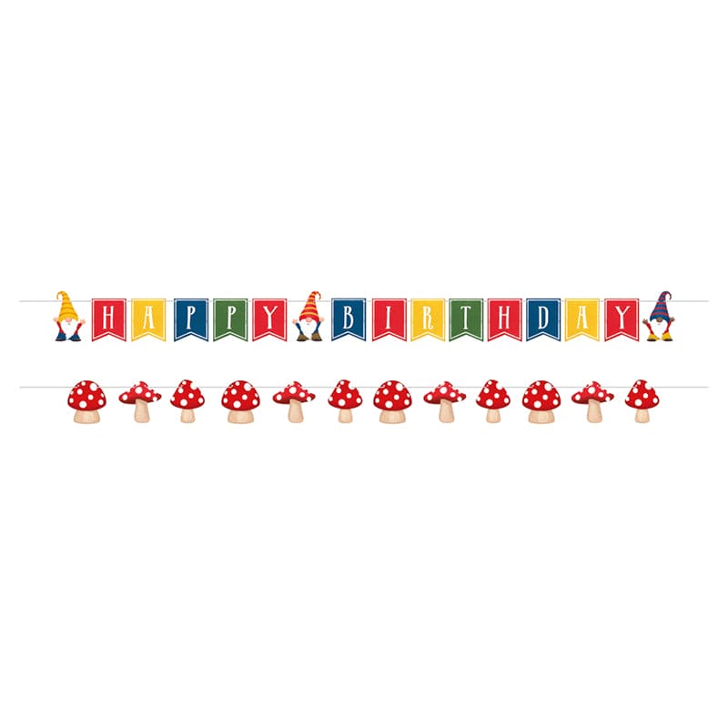 Party with Gnomes! Add these banners to your enchanted forest birthday party scene for festive look. Happy Birthday banner with gnomes and mushroom banner will look great on the wall or over the doorway. Both banners measures 5in x 97in.
