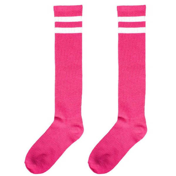 These athletic knee-high socks are solid pink with two bright, clean white stripes near the top. One size fits most, two socks per pair.