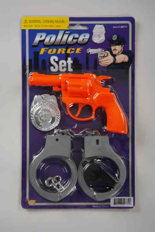 Create or complete any costume look with our Police Force Set costume kit for a quick and easy Halloween Costume Our Police Force Set is a costume prop kit that features a toy orange revolver a badge and toy handcuffs This accessory kit goes great with other police force costume props and accessories Additional Costumes and accessories are available and sold separately