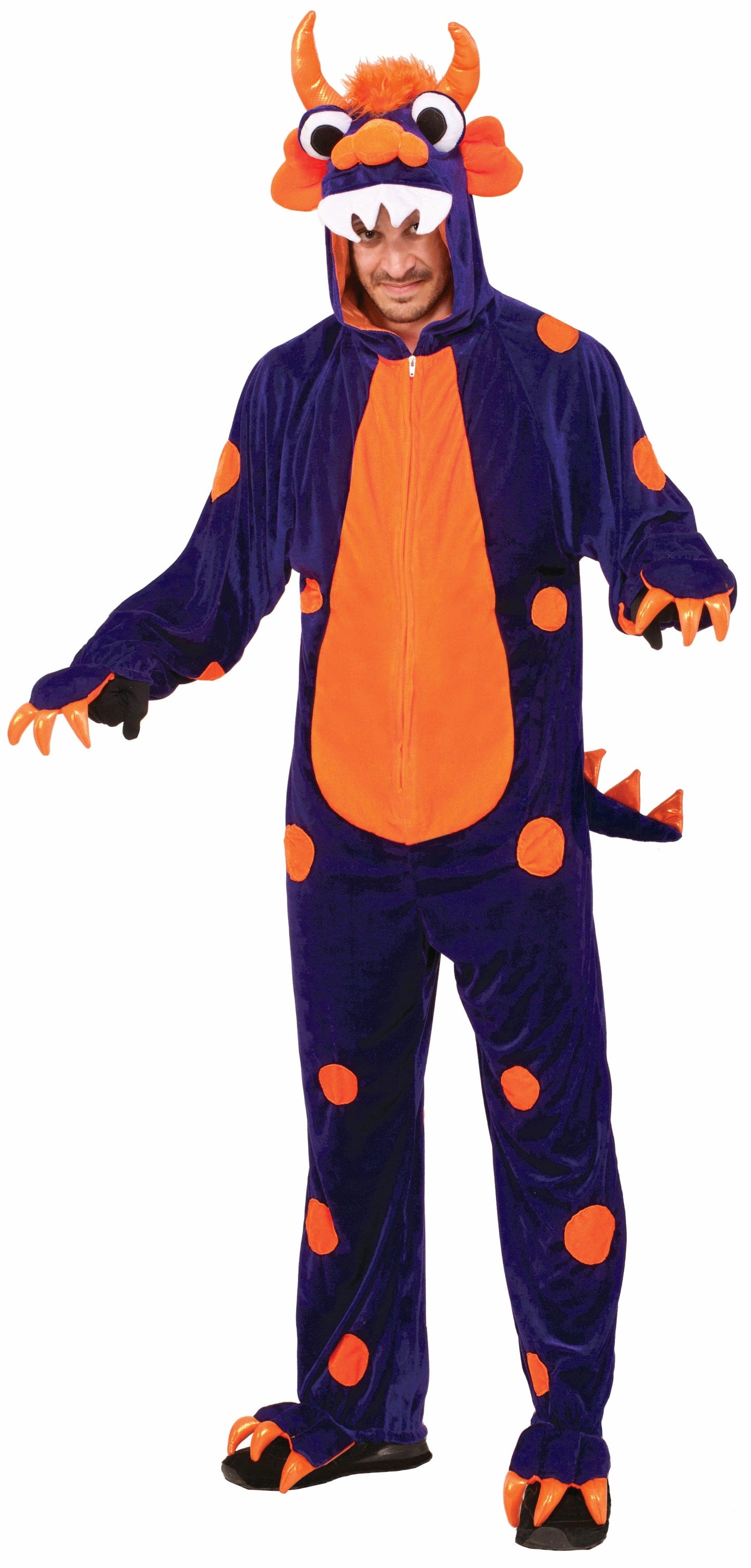 Purple Monster Onezy Adult Costume includes: Jumpsuit With Attached Hood, Hand & Shoe Covers.