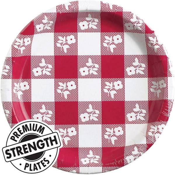 Have a delightful picnic with our Red and Blue Gingham Tableware Collection that has red and white colors with little flowers in the print Our Red Gingham Round Dinner Plates measure approximately 9in in diameter and are considered premium strength plates Each package contains 8 dinner plates and this collection has red and blue party supplies
