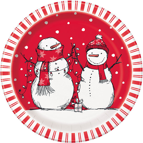 Red Stripes Snowman 9in Round Dinner Paper Plates 8ct