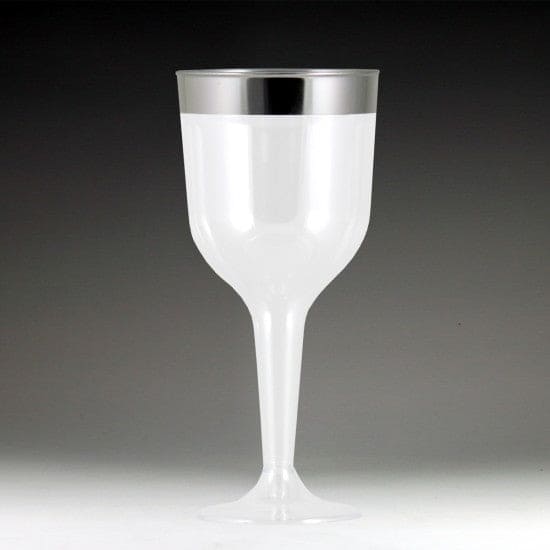 The Regal Ultra collection boasts an impressive selection of drinkware and plates with one of the most upscale looks on the market. These 10 oz two-piece premium clear plastic wine glasses with silver rim are great for many occasions and the package includes 6 glasses. Manufactured BPA Free.