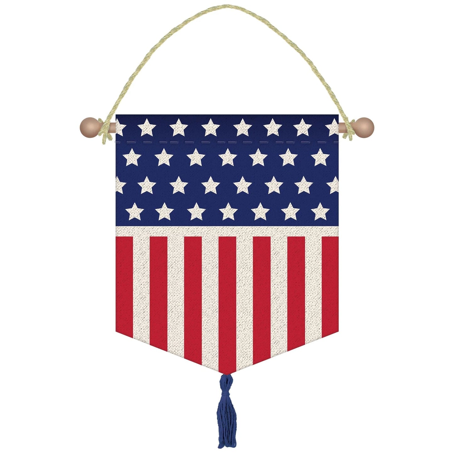 This Canvas Striped N' Stars Hanging Banner measures 14.5in x 9in.