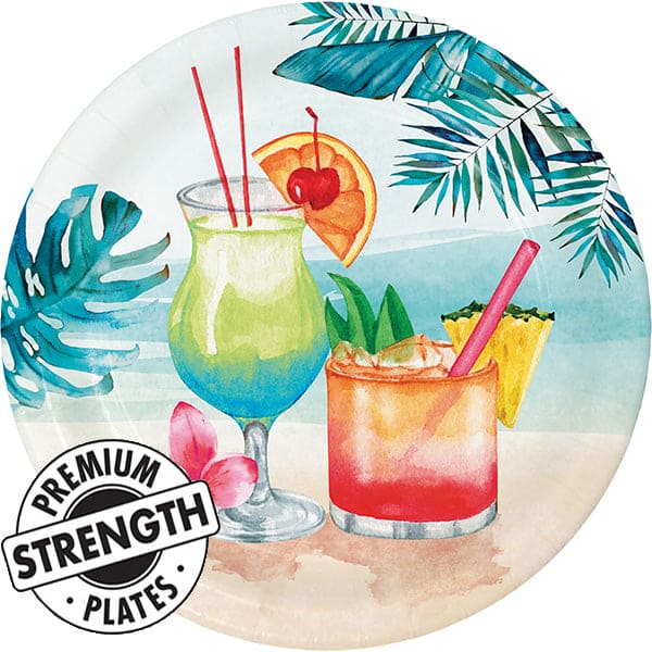 Kick off the summer party and keep it cool with this sturdy style Summer Breeze tableware that features refreshing and tasty looking cocktails. Use these 9in dinner plates to serve dinner and other party foods in colorful grandeur! Each pack contains 8 plates.