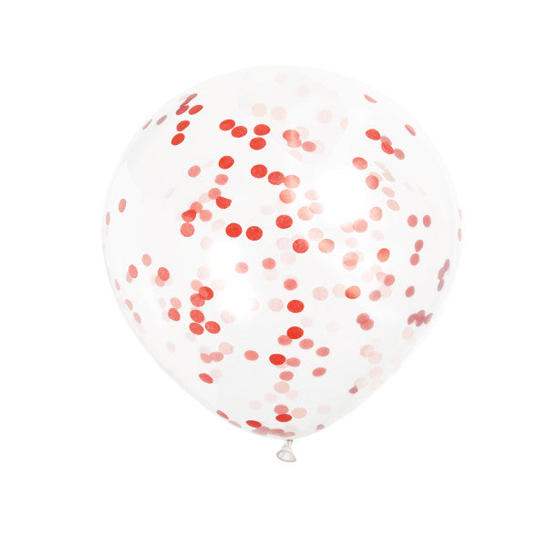The package includes 6 Clear w/Red Confetti 12in Latex Balloons.