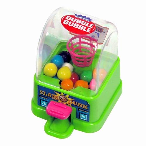 This mini basketball bubblegum slam dunk toy is fun and entertaining. Use the lever to shoot the colorful gumballs into the hoop. Great party favor, stocking stuffer and more. One Slam Dunk Bubblegum Dispenser per package. Measures 3.5in x 2.5in. Item color varies.