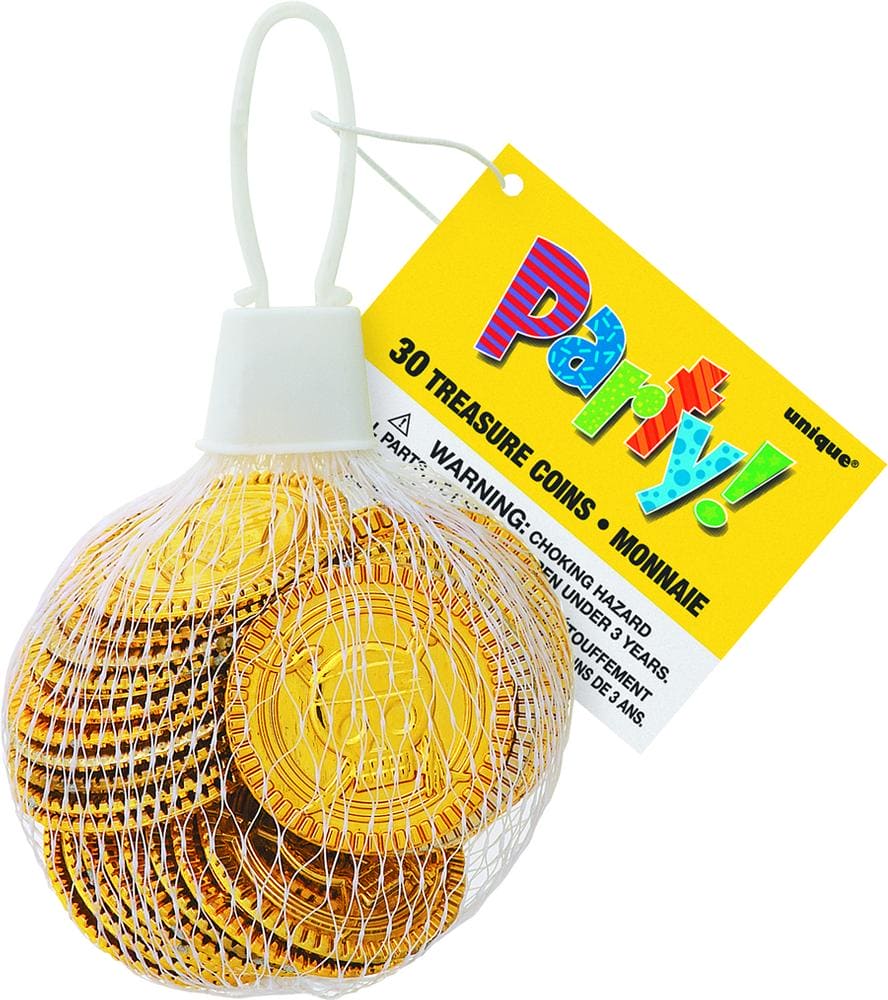 These cool Pirate Treasure Coins make perfect party favors price tokens and more Each gold coin features a skull and crossbones logo on one side and a treasure chest logo on the other side The bag includes 30 Treasure Coins Not intended for children under 3 years